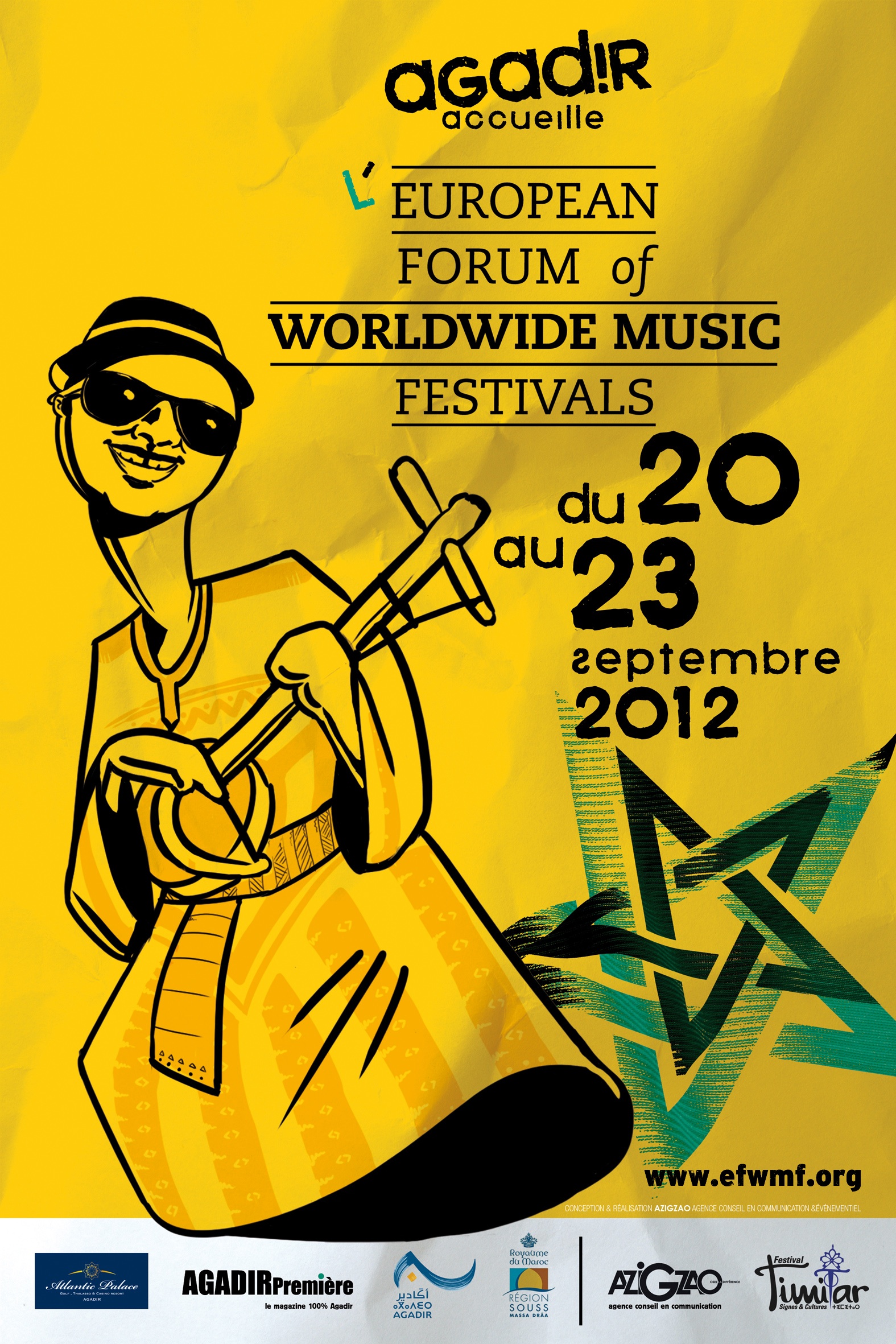 اكادير تستقبل من 20 الى 22 شتنبر2012 ، منتدى مهرجانات موسيقى العالم بأوروبا . لقاء يجمع على فكرة واحدة وهي أن “العالم خليط من ملايين العادات المحلية و الموسيقية، و كل واحدة تختلف عن الاخرى في المضمون لكن لا اختلاف بينها من حيث القيمة “.