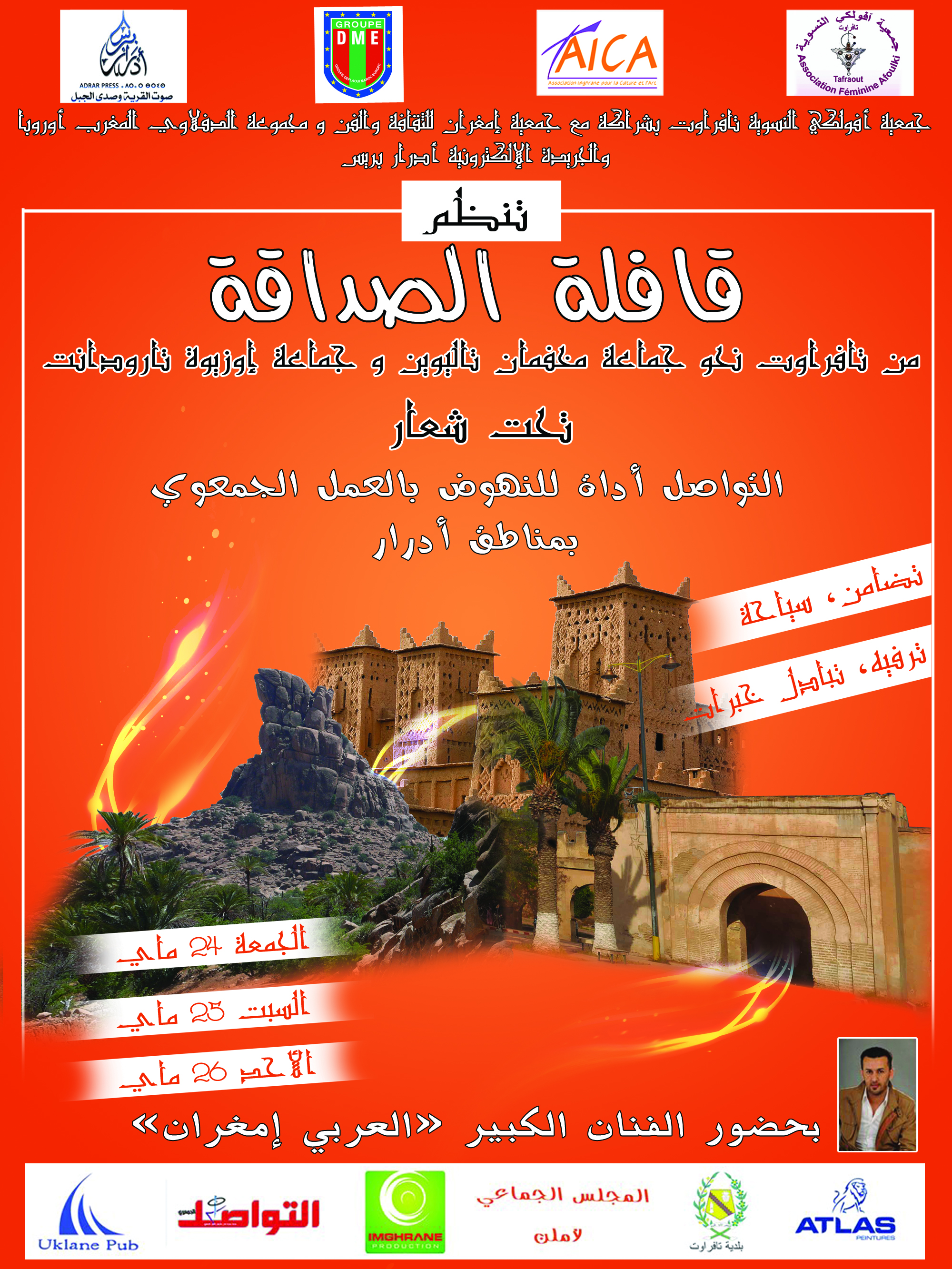 تعتزم جمعية أفولكي النسوية بتافراوت بشراكة مع جمعية إمغران للثقافة والفن والجريدة الإلكترونية أدرار بريس وبمشاركة رمزية نبيلة للفنان العربي إمغران تنظيم قافلة الصداقة يومي السبت والأحد 25 و 26 ماي الجاري، وهي عبارة عن قافلة نسوية تضامنية ستنطلق من مدينة تافراوت في اتجاه منطقة أوزيوة بتارودانت ومخفمان بتالوين، وسيتم خلالها توزيع مجموعة من الهدايا والهبات عبارة عن ألبسة وأزياء تافراوتية وأحذية تافراوت ولوازم مدرسية على ساكنة المناطق المستهدفة. وتصبوا جمعية أفولكي من خلال هذه القافلة إلى توطيد أواصر التواصل مع ساكنة المناطق المستهدفة خاصة فئة النساء، وتسويق تجربة جمعية أفولكي النسوية بتافراوت وتبادل الخبرات مع نساء هذه المناطق، والتعرف على ثقافة ومؤهلات المناطق التي سيتم زيارتها، والتعريف بمؤهلات مدينة تافراوت وبثقافتها، وذلك عبر التواصل مع ساكنة المناطق المستهدفة خاصة فئة النساء في إطار قافلة الصداقة. والعمل على توعية فئة النساء بأهمية الإنخراط في العمل التعاوني والجمعوي والمساهمة في تنمية المجتمع في إطار وعي شامل بالحقوق والواجبات. إلى جانب استهداف تطوير الروح التضامنية لدى منخرطات جمعية أفولكي النسوية و إتاحة الفرصة لهن للتعرف على المناطق المستهدفة والإطلاع على بعض الأنشطة النسوية التي تمارس بها خاصة إنتاج الزربية التازناختية وزعفران تالوين. وتعد هذه القافلة ضمن سلسلة مبادرات شبيهة تعتزم جمعية أفولكي النسوية تنظيمها إلى مناطق قروية ونائية مختلفة تحت شعار :”التواصل أداة لتأهيل العمل الجمعوي بمناطق أدرار”.