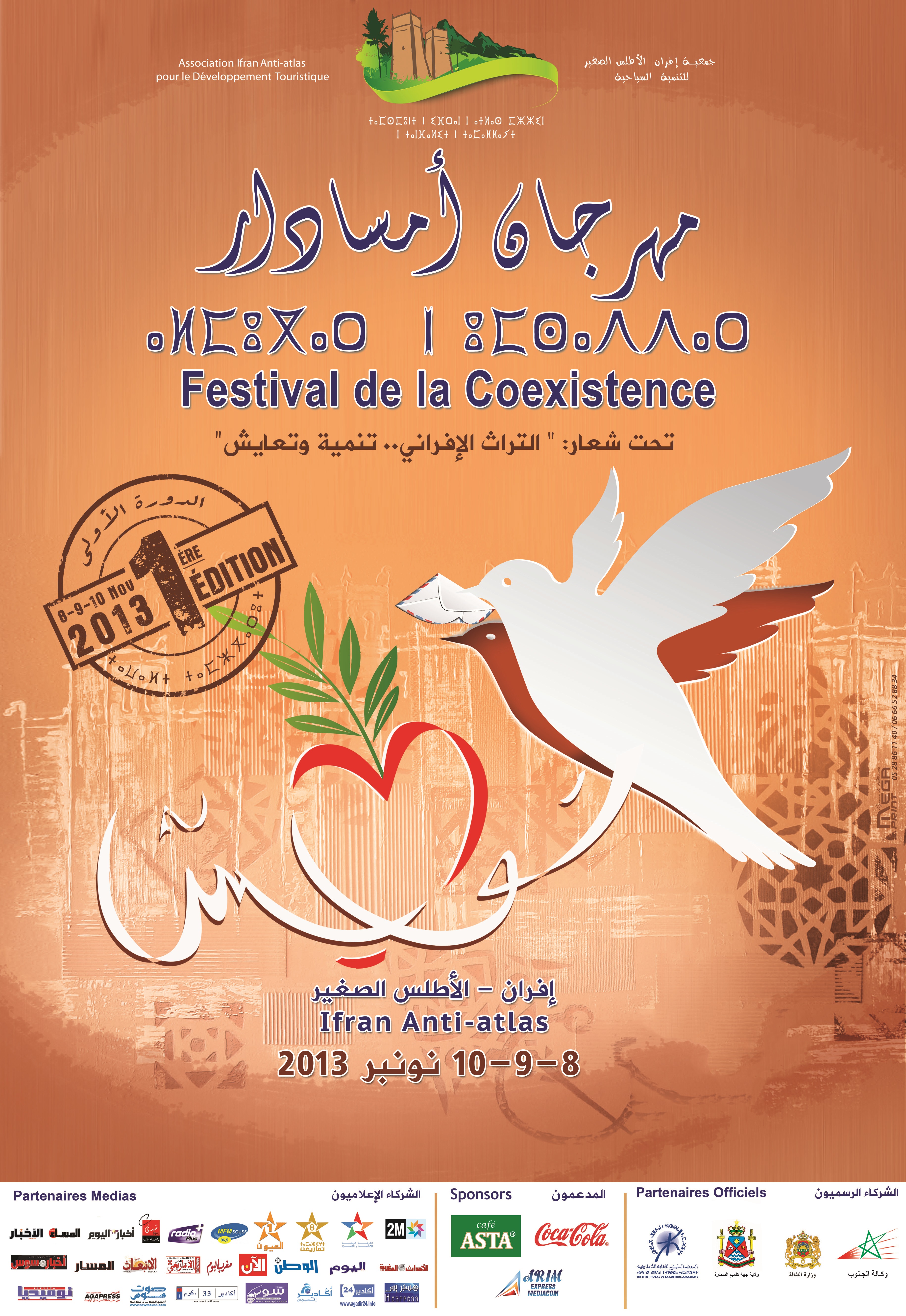 بمناسبة الذكرى 38 للمسيرة الخضراء المظفرة و الذكرى 58 لعيد الاستقلال المجيد ، تنظم جمعية إفران-الأطلس الصغير للتنمية السياحية، بشراكة مع وكالة الإنعاش والتنمية الاجتماعية والاقتصادية لأقاليم الجنوب، ووزارة الثقافة، والمعهد الملكي للثقافة الأمازيغية و بعض فعاليات المجتمع المدني الافراني الفاعل ، فعاليات الدورة الأولى من مهرجان أمسادار (التعايش) بجماعة إفران الأطلس الصغير خلال الفترة الممتدة ما بين 08 و 10 نونبر 2013، تحت شعار “التراث الإفراني.. تنمية وتعايش”.