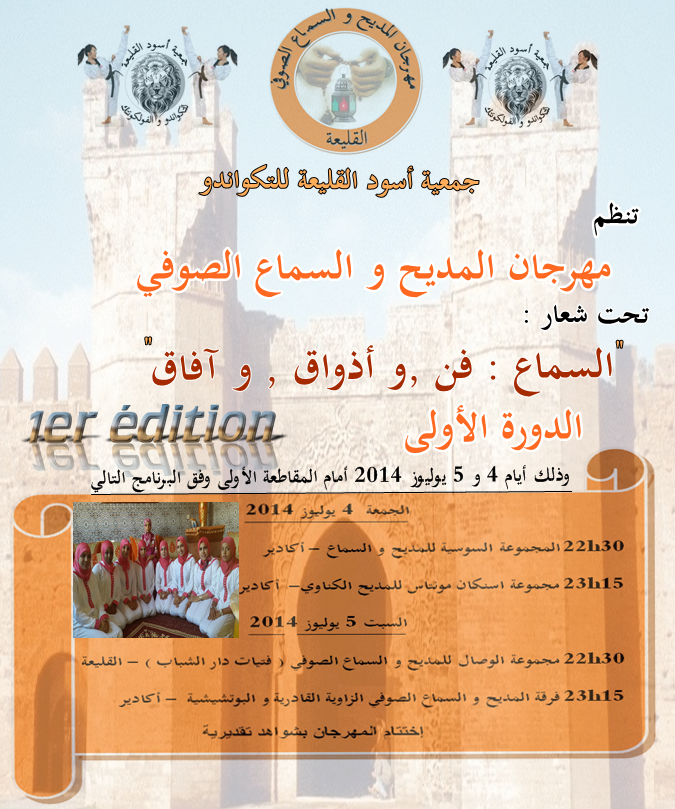 بمناسبة شهر رمضان الكريم تنظم جمعية أسود القليعة للتايكواندو بتنسيق مع المجلس البلدي القليعة و دار الشباب المهرجان الاول للمديح و السماع الصوفي بالقليعة خلال أيام 4و 5 من شهر يوليوز 2014.