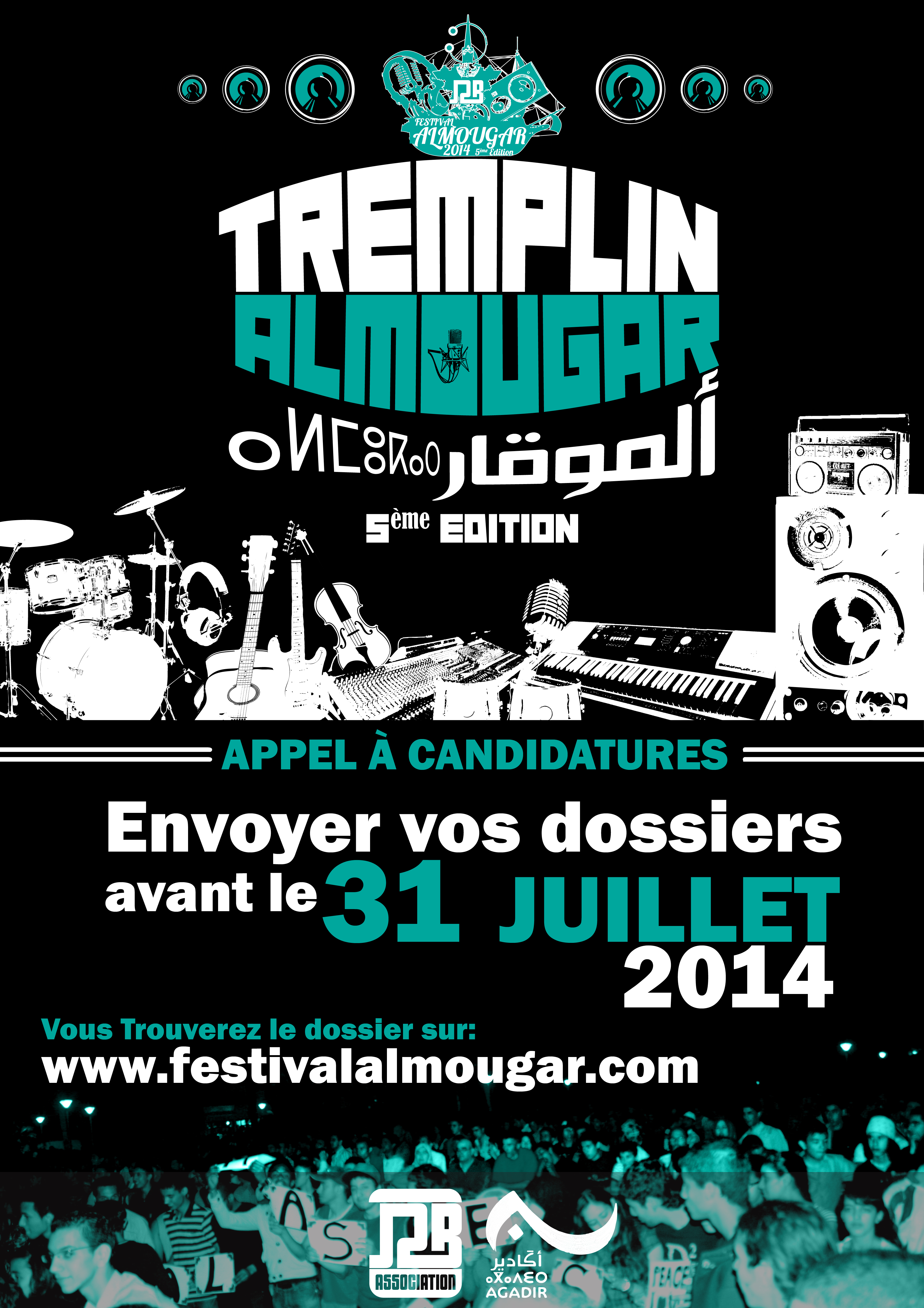 يفتح المهرجان في دورته الخامسة باب الترشيحات لTremplinAlmougar »«للفنانين الشباب لإعطائهم فرصة اكتشاف مقومات العمل اﻹحترافي على المنصة وكذا مساعدتهم على التواصل مع محترفي الموسيقى.