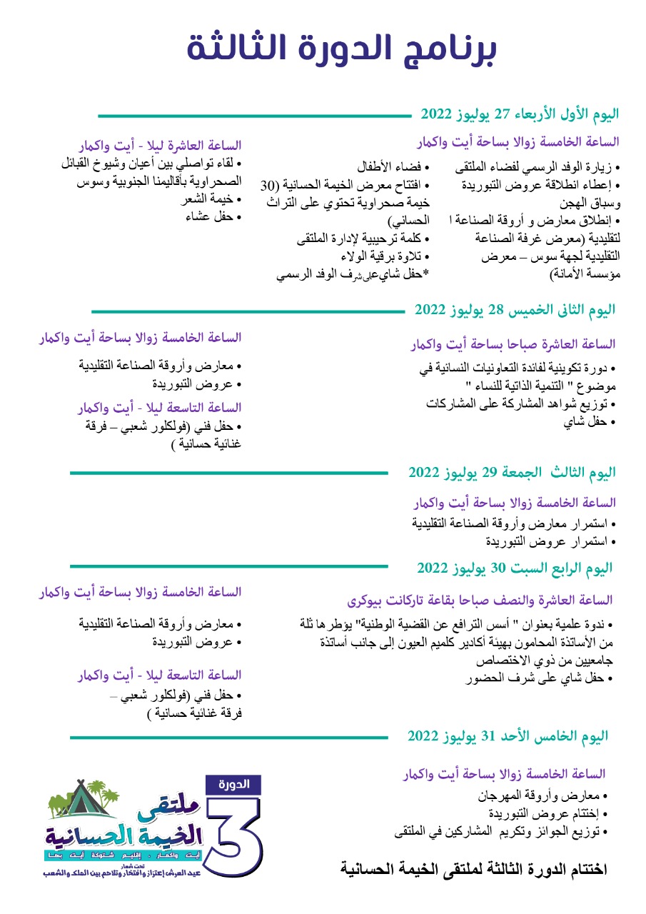 في إطار الاحتفالات بعيد العرش المجيد، تستعد جمعية ” الخيمة الحسانية ” لإقامة فعاليات النسخة الثالثة من ملتقى الخيمة الحسانية خلال الفترة الممتدة من 27 إلى 31 يوليوز الجاري  ب  ” أيت واكمار  ” وادي الصفا،  إقليم اشتوكة أيت باها.