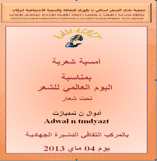 خدمة للشاعر او انضامن بالامازيغية ، وارتباطا بانفتاحها على المحيط ، تستعد جمعية “اسافن ن تكوري ” للثقافة والتنمية الموجود مقرها بانزكان ، لتنظيم امسية شعرية بمناسبة اليوم العالمي للشعر ، والذي اختارت له شعار ” ادوال ن تمديازت ” وذلك يوم 04 ماي 2013 بالمركب الثقافي الدشيرة ، والذي قد يفيد في السير قدما بالاشادة وتشجيع الشعراء الامازيغ على الابداع الفني وتكريمهم لماقدموه للفن الامازيغي .