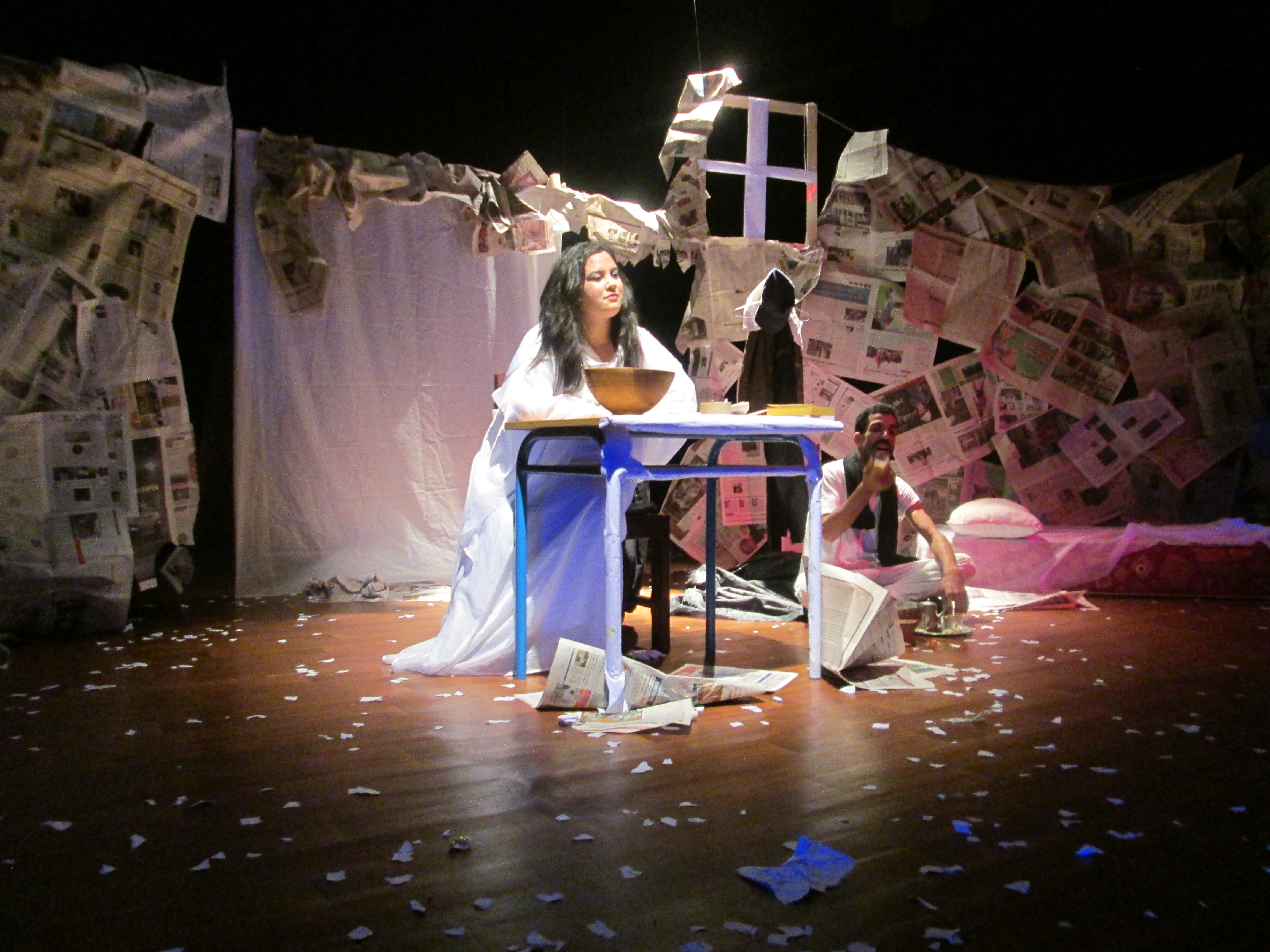 في بداية العرض ظهر شاب على الخشبة والإكسسوار يبين انه متواجد داخل غرفة تتوفر على أثاث ومكتبة قديمة وجدرانها ملصقة بصفحات من صور الجرائد ، ظهر وهو جالس على كرسي وأمامه طاولة قديمة ،شاحب الوجه وملامح وجه تبين انه ساخط على الوضع الذي يعيش فيه ، ظهر وهو يدخل السجائر و يدمدم بكلمات مؤلمة ويحاور كتبه ومكتبته موجها اللوم للحياة ومن يعيش فيها بمشاكلها وآهاتها ، مرة يفتخر بكتبه الشاهدة على حياته ومرة يوجه لها التهم ، مرة يقول ان الكتاب خير جليس ومرة انه عدو وانه قد يكون نقمة بعد ان تظنه نعمة .