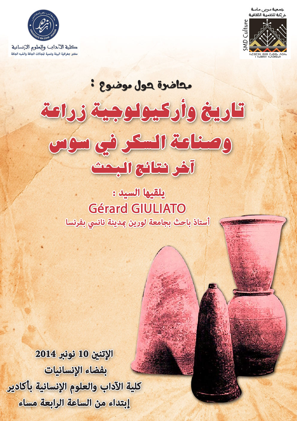 تنظم جمعية سوس ماسة درعة للتنمية الثقافية بتعاون مع مختبر جغرافية البيئة وتنمية المجالات الجافة والشبه الجافة التابع لشعبة الجغرافية بكلية الآداب والعلوم الانسانية بأكادير محاضرة حول موضوع “تاريخ وأركيولوجية زراعة وصناعة السكر في سوس : آخر نتائج البحث” يلقيها السيد Gérard GIULIATO أستاذ باحث بجامعة لورين بمدينة نانسي الفرنسية، وذلك يوم الإتنين 10نونبر 2014بفضاء الإنسانيات بكلية الاداب والعلوم الإنسانية بأكادير إبتداء من الساعة الرابعة مساء. ويأتي تنظيم هذه المحاضرة في إطار التعريف بالمعالم التراثية التي تزخر بها جهة سوس ماسة درعة وخصوصا المعالم التاريخية والأثرية لزراعة وصناعة السكر بسوس والتي أتت عليها عوامل الزمن وطالها الخراب والدمار…، أملا في التعريف بها وإعادة الإعتبار إلى مخلفاتها الأثرية وإدماجها في مسالك السياحة الثقافية مستقبلا. كما يأتي تنظيم هذا النشاط في إطار إنفتاح الجمعية على محيطها الخارجي وخصوصا جامعة إبن زهر كمشتل لمختبرات البحث العلمي وتعميق الدراسات في مختلف الظواهر الثقافية والبشرية والطبيعية.