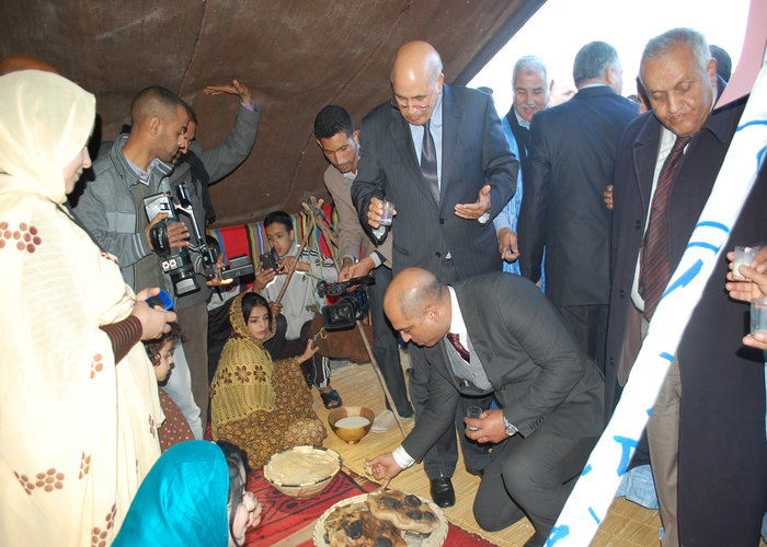 كما قام الوفد بزيارة لمعرض التراث والعادات والتقاليد القبيلة ، بحيث قدمت لهم شروح في كل خيمة عن ما تحتويه من دلالات للموروث التراثي الصحراوي الاصيل والذي يبين مدى عراقة هذه القبيلة والحفاظ على تراث الاجداد ، كما ولج الوفد المرافق للوالي معرض خص بالصناعة التقليدية والمنتجات الفلاحية والحيوانية بحيث طافوا على أرجاء اجنحة هذا المعرض الفسيح والذي ظهرت من خلاله براعة الصانع التقليدي الحساني كمشارك اساسي في التنمية المحلية .