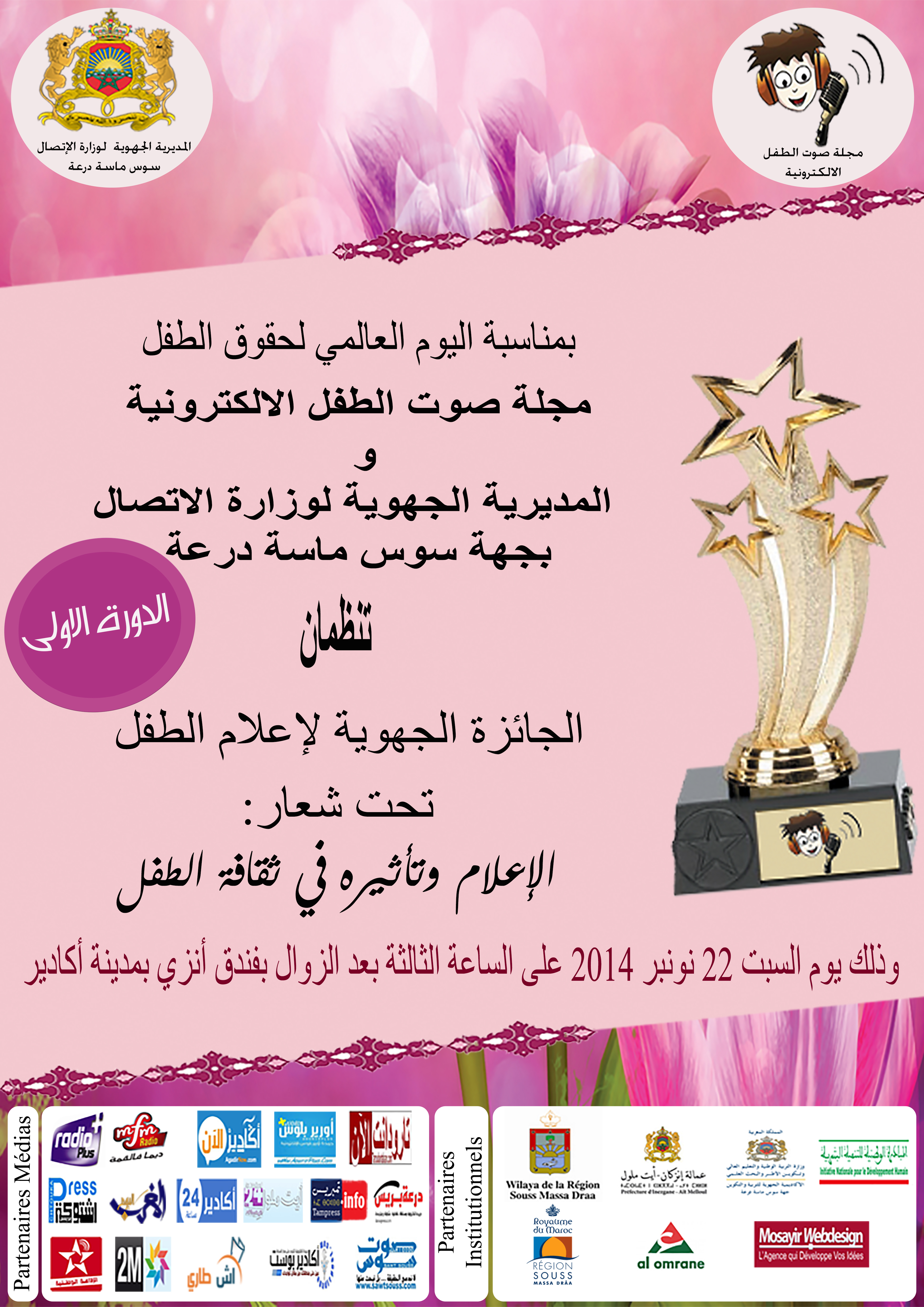 سيعرف فندق انزي مساء اليوم السبت 22 نونبر 2014 ابتداءا من الثالثة حفل بهيج لتتويج بالفائزين بالجائزة الجهوية الاولى لاعلام الطفل ، من تنظيم مجلة صوت الطفل وبشراكة مع المديرية الجهوية للاتصال .