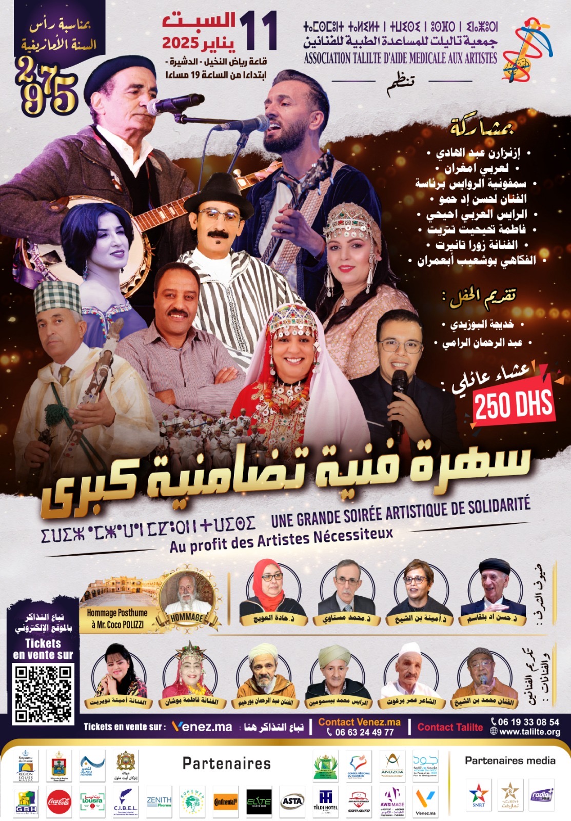 بمناسبة حلول السنة الأمازيغية الجديدة 2975 ،،أبت جمعية تاليلت للمساعدة الطبية للفنانين أن تنظم سهرة فنية تضامنية كبرى لفائدة الفنانين ،وذلك يوم 11 يناير المقبل برياض النخيل بالدشيرة الجهادية ،بمشاركة مجموعة إزنزارن عبد الهادي ،العربي إمغران ،سمفونية الروايس برئاسة الفنان لحسن إدحمو ،إضافة إلى الرايس العربي إحيحي ،فاطمة تحيحيت تتريت ،الفنانة تانيرت والفكاهي بوشعيب أبعمران .