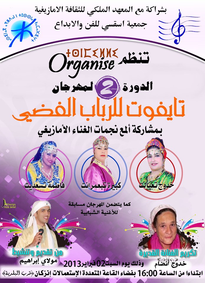 و ابتداءا من الساعة الثالثة بعد الزوال سوف تبتدا مسابقة تيروبا لتتويج فائز الدورة بالرباب الفضي لتبتدأ بعد الذلك السهرة التي خصصت هذه السنة للعنصر النسوي وتكريم فن الرايسات بمشاركة كبيرة تبعمرانت وخدوج تعيالت وفاطمة تسعديت وسوف تتوج السهرة بتكريم قيدومة الممثلات الامازيغيات خدوج أنضام ( تمحضيت ) ومفاجات اخرى سوف يسهر على تنشيطها المنشط الشاب الموهوب مولاي ابراهيم