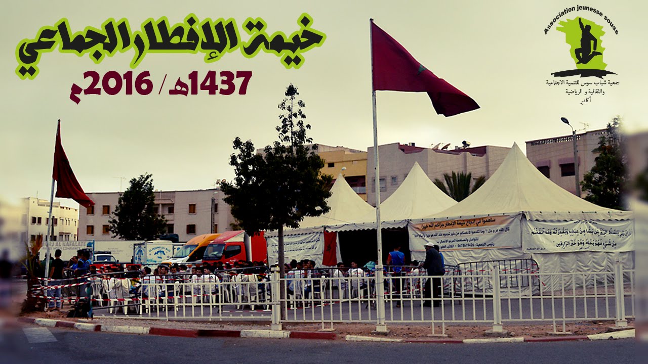 فيديو خيمة الافطار الجماعي لشهر رمضان الأبرك 1437 ه المنظمة من طرف جمعية شباب سوس للتنمية الاجتماعية و الثقافية و الرياضية بمدينة أكادير و قد تم تصنيفها من بين أحسن و أجمل خيمات الافطار بالمغرب السنة الفارطة و هذه السنة تتألق من جديد لتكون من الخيمات الجميلة التي تستضيف أزيد من 200 صائم كل يوم