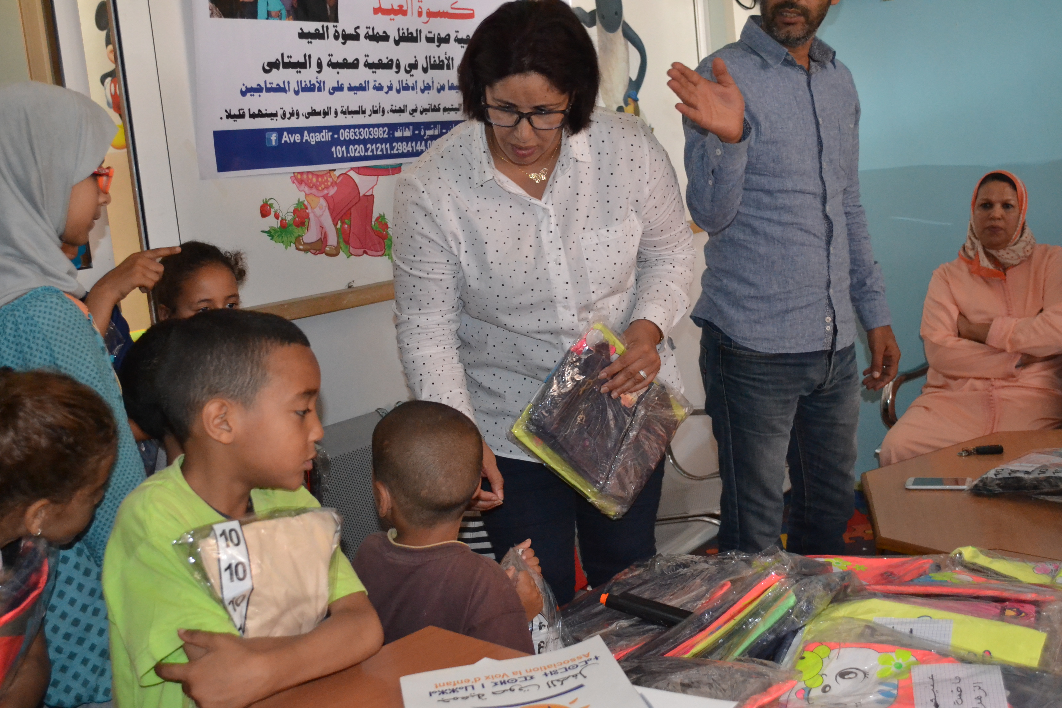 تفعيلا لمبدأ التضامن الاجتماعي الذي تضعه جمعية صوت الطفل باكادير ضمن أسمى أهدافها وسعيا لإدخال الفرحة إلى قلوب الأطفال منهم المنحدرين من اسر فقيرة ومعوزة ومنهم الأيتام  ورسم البسمة على شفاههم ،نظمت حفلا لتوزيع كسوة العيد على الأطفال من قبل الجمعية ولفائدة أسرهم وإخوتهم وذلك بإحدى الفضاءات بمدينة الدشيرة الجهادية  وظلك مساء اليوم السبت 02 يوليوز 2016 ، بحيث استفاد من هذا العمل الخيري 183 طفل وطفلة  .