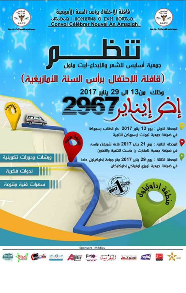 تنظم جمعية أسايس للشعر والابداع الكائنة بأيت ملول قافلة الاحتفال برأس السنة الامازيغية “إيض ايناير” وذلك من 13 الى 29 يناير 2017 ،