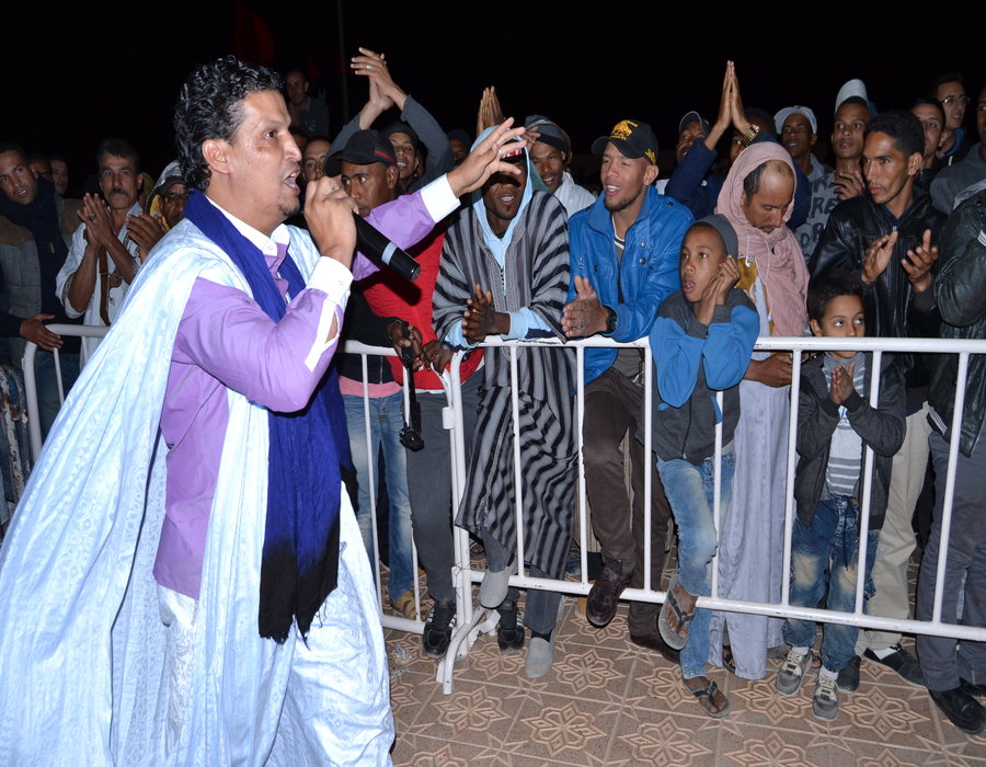 كان الجمهورالسوسي البارحة بكورنيش اكادير على موعد مع الفنان الحساني ” مصطفى الكمراني ” ، بحيث أتحف الجماهير على رمال شاطئ اكادير باحلى واعذب الاغاني الحسانية والتي تماشت مع الحانها وكلماتها الحناجر المدوية ، وبذلك الزي الصحراوي ” الدراعة ” واللثام الازرق السماوي، اعطى الفنان صورة في غاية من الجمال وهو يؤدي اغانيه الحسانية ومما زادها انبهارا وانجذابا البحة الصوتية التي يتوفر عليها مصطفى الكمراني ، وبتلك المماويل المتميزة، جعلت من في الجبل والسهل يسمعها وينساب الى مكان الحفل بدون شعور تحت تاثير الاذاء الرائع والتناسق المتناغم بين الآلات الموسيقية والضرب على الطبل العجيب والغريب .