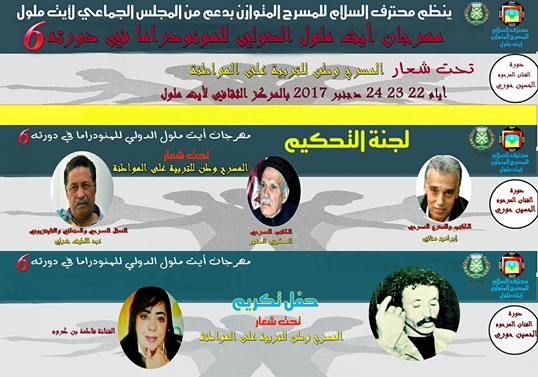 أعلنت اللجنة المنظمة لمهرجان أيت ملول الدولي لمسرح المنودراما في دورته السادسة المنظم من طرف جمعية محترف السلام للمسرح المتوازن بأيت ملول بدعم من المجلس الجماعي لايت ملول، دورة الفنان المرحوم الحسين حوري، تحت شعار: ” المسرح وطن للتربية على المواطنة ” والمزمع تنظيمه أيام 22 و23 و24 دجنبر 2017 بالمركز الثقافي لأيت ملول، -أعلنت- في ندوة صحفية أمس الجمعة عن البرنامج العام للمهرجان والذي سيكون على الشكل التالي :