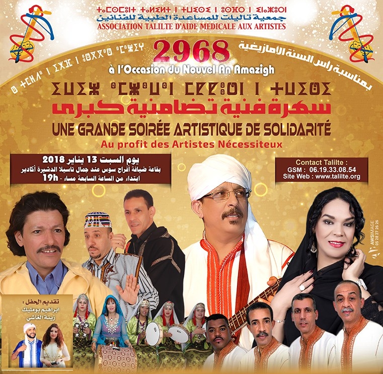 في إطار الإحتفالات بالسنة الأمازيغية الجديدة “إيض يناير”، وكعادتها سنويا وللمرة الثامنة على التوالي، ستنظم جمعية “تاليلت للمساعدة الطبية للفنانين” حفلا تضامنيا كبيرا يخصص ريعه لفائدة الفنانين المحتاجين، وذلك يوم السبت 13 يناير 2018 ابتداء من الساعة السابعة مساء (19h00) بقاعة ضيافة أفراح سوس عند جمال تاسيلا الدشيرة أكادير.