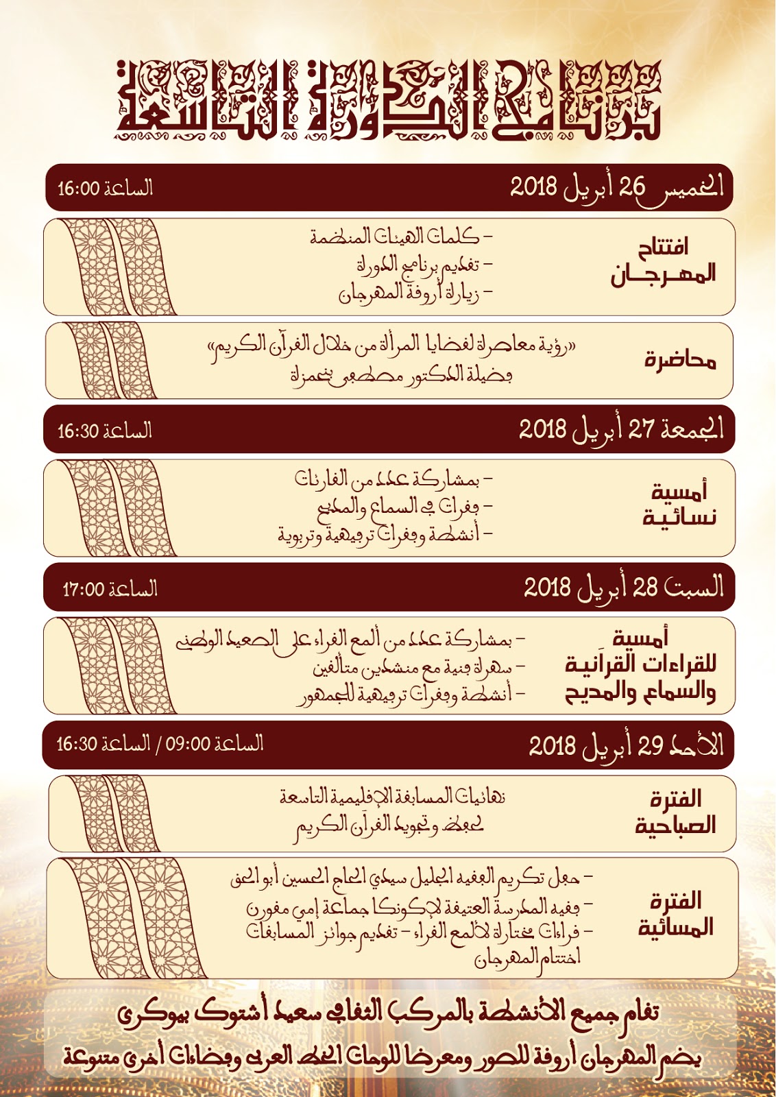 وسعيا من اللجنة المنظمة للمهرجان للحفاظ على المكتسبات المحققة ، وتحقيق المزيد من التميز والاستمرار والاشعاع ، فان الدورة التاسعة لهذه التظاهرة سوف تشهد تنظيم محاضرة مركزية في موضوع “رؤية معاصرة لقضايا المرأة في القرءان الكريم”لفضيلة العلامة الدكتورمصطفى بنحمزة عضو المجلس العلمي الاعلى ورئيس المجلس العلمي المحلي لوجدة، فضلا عن إجراء الدور النهائي للمسابقة الاقليمية التاسعة لحفظ القرءان وتجويده، كما أنه سيتم تكريم الفقيه الجليل الحاج الحسين ابو الحق فقيه المدرسة العتيقة اكونكا بجماعة امي مقورن، إضافة إلى أن الدورة ستعرف مشاركة العديد من القراء المشهورين، ومجموعات المديح والسماع، إضافة إلى تنظيم أنشطة موازية.