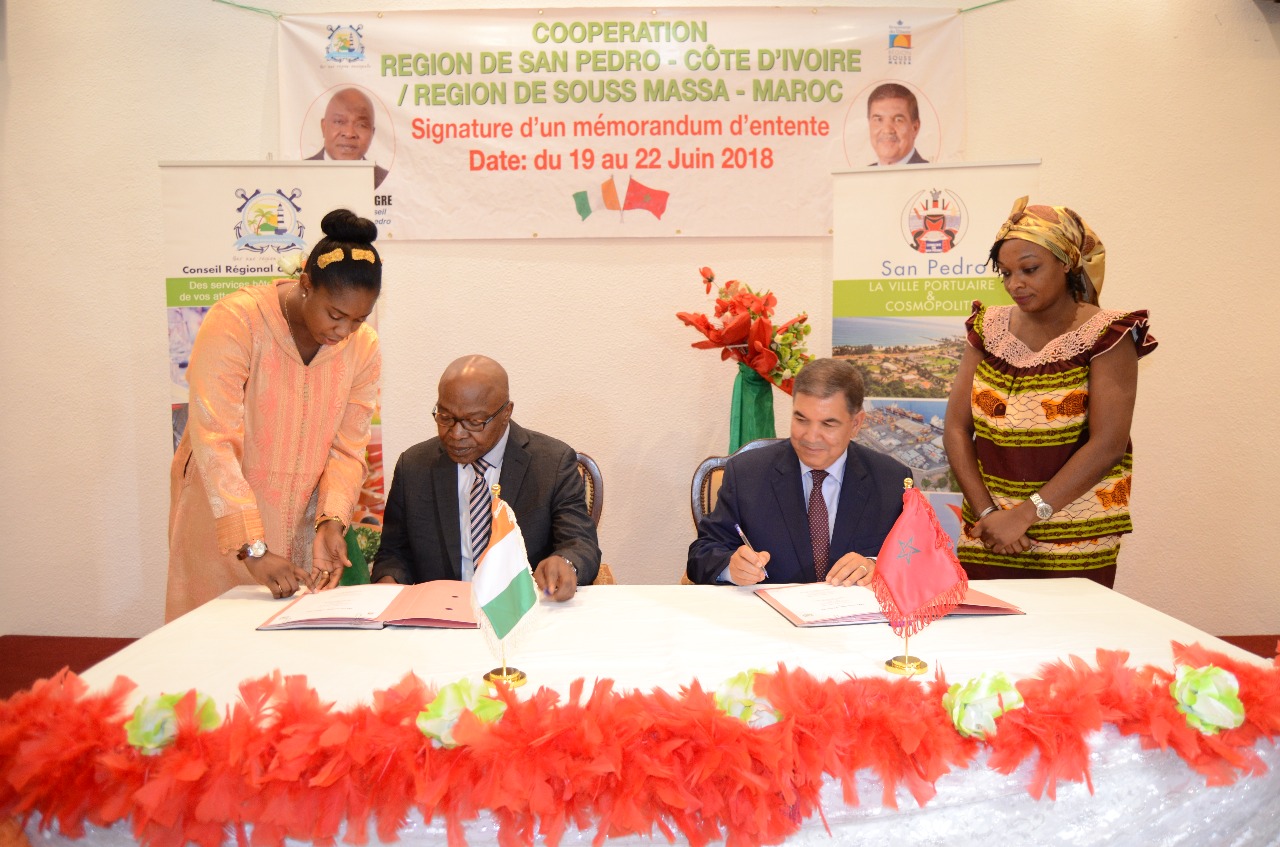 تم تتويج زيارة وفد جهة سوس ماسة لجهة سان بيدرو بالكوت ديفوار، التي أجريت ما بين 18 و 23 يونيو 2018، بتوقيع مذكرة تفاهم بين الجهتين يوم الجمعة 22 يونيو، و قد وقعها كل من السيد ابراهيم حافيدي رئيس مجلس جهة سوس ماسة و السيد Donatien Beugré رئيس جهة سان بيدرو. و تأتي هذه المذكرة الاطار نتيجة رغبة الطرفين في تفعيل التعاون و تنمية الشراكة على المدى الطويل بين الجهتين.
