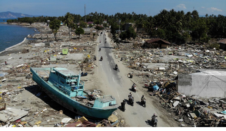 أشخاص على طريق بحري أمام قارب جرفته مياه المحيط ومبانٍ منهارة في بالو، إندونيسيا، بعد زلزال وتسونامي ضربا المنطقة (أرشيفية)