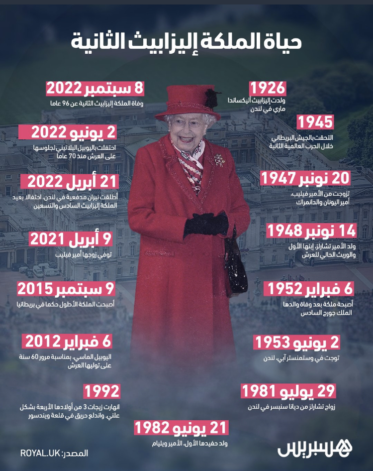 ومن السريع عن الملكة التي كانت ملمة جدا بالفرنسية، أنها عاصرت 15 رئيسا للوزراء، أولهم ونستون تشرشل وآخرهم “ليز تراس” التي زارتها الثلاثاء الماضي في قصر “بالمورال” باسكتلندا. كما عاصرت 14 رئيسا أميركيا منذ اعتلائها للعرش، وقامت261 مرة بزيارات رسمية شملت 116 دولة، ونشطت كراعية ورئيسة لأكثر من 600 جمعية خيرية بأعمال إنسانية، وهنأت بالبرقيات 175 ألفا لمناسبة بلوغ عمر الواحد منهم 100 عام، وهنأت 540 ألفا لمناسبة يوبيل زواجهم الماسي، وهو 60 سنة، وأصبحت في 1976 أول من يقوم بإرسال إيميل بين زعماء العالم، وتسلمت أكثر من 3 ملايين و500 ألف رسالة، محفوظة كلها لديها.