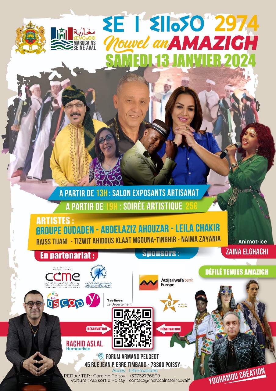 بشراكة مع الوزارة المكلفة بالمغاربة المقيمين بالخارج وشؤون الهجرة و المجلس الاستشاري للمغاربة بالخارج ،تنظم تنسيقية المغاربة “السين أفال”،فعاليات النسخة الأولى للسنة الأمازيغية “إيض يناير “يومه السبت 13 يناير المقبل بقاعة “أرماند بيجو ” بفرنسا .