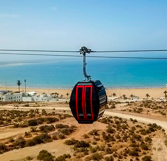 مدينة أكادير، عروسة الجنوب، تسير بثبات نحو مستقبل واعد، حيث يتجلى التطور والتحسن في كل المجالات. استمتع بالمنظر الرائع على متن التليفريك، حيث يكشف تشجير الأراضي وتصميمها الرائع عن جمال الطبيعة.