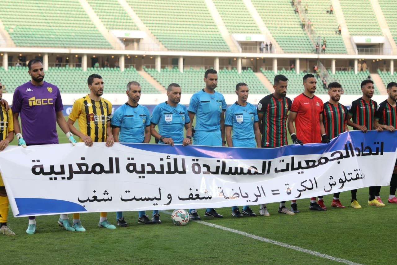 قبل انطلاق المباراة، رفع اللاعبون لافتة تعبر عن رسالة نبيلة تحمل توقيع اتحاد الجمعيات المساندة للأندية المغربية. كُتب على اللافتة: “ما نقتلوش الكرة، الرياضة شغف وليس شغب”، في إشارة واضحة إلى أهمية الحفاظ على الروح الرياضية والتنافس الشريف بعيداً عن أي ممارسات تفسد متعة اللعبة.