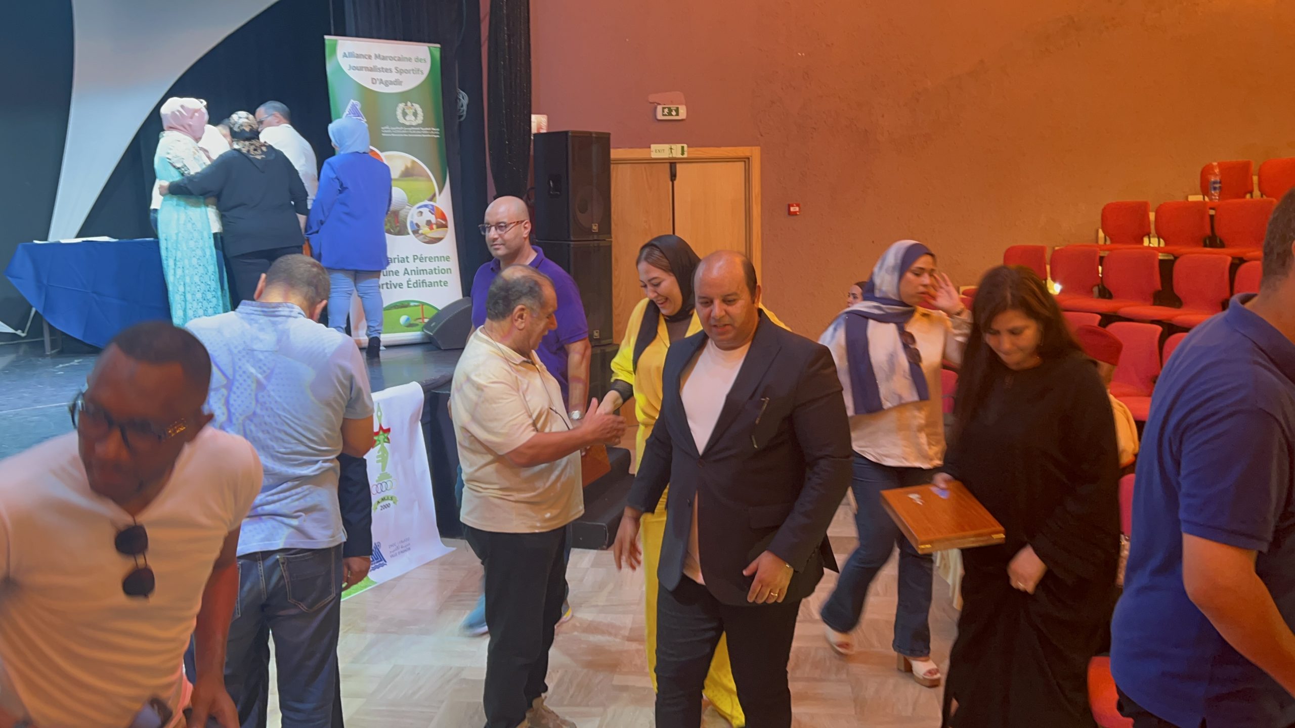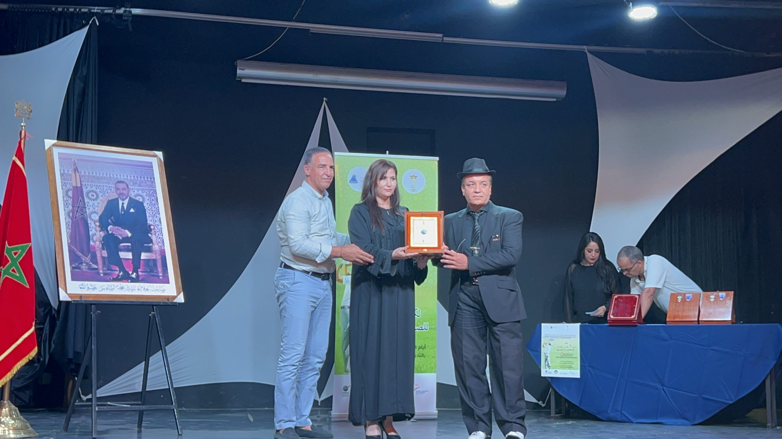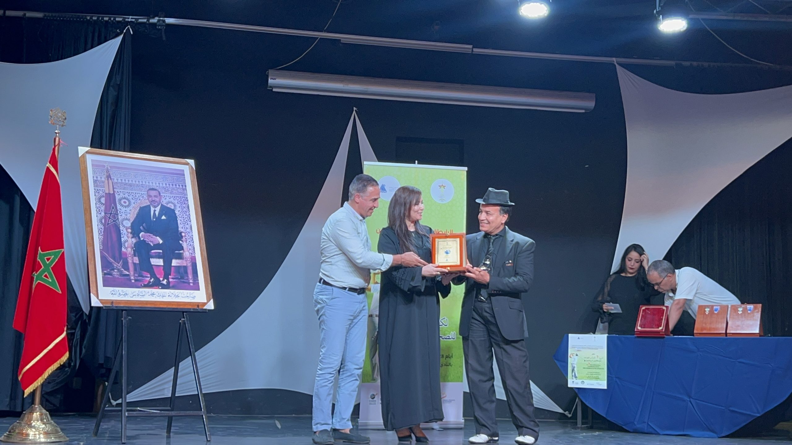 بدأ الحفل وسط أجواء مليئة بالحماس والترقب في مدرج فندق التلال الذهبية “Les Dunes d’Or”. الحضور كان مميزًا، ضم نخبة من الصحفيين البارزين والشخصيات المؤثرة في مختلف المجالات. من بين هؤلاء كان الحسين العلالي وفاطمة الزهراء الوحيدي، اللذان أشرفا على تنشيط الحفل بروح عالية من المهنية والإبداع.