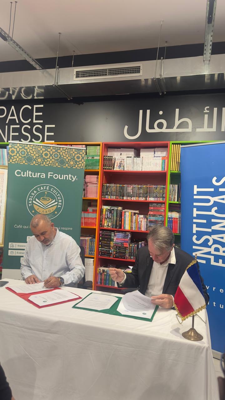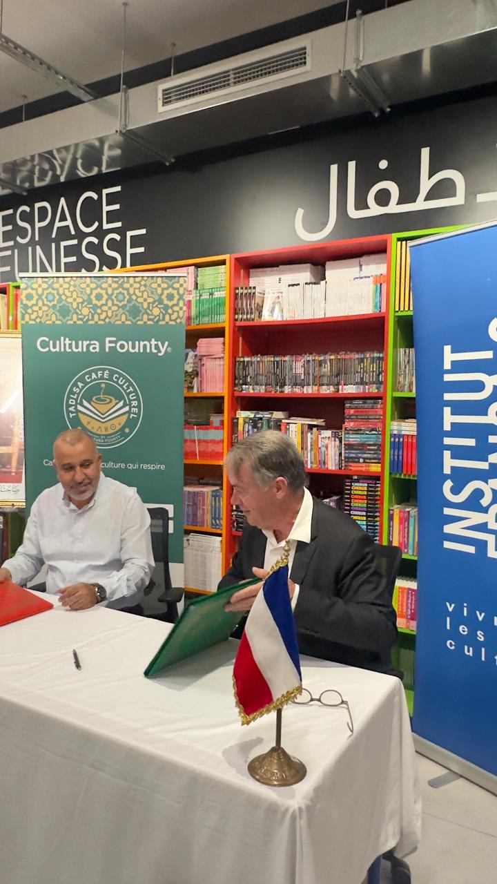 شهد مقر المقهى الادبي ” كيلتغا فونتي ” Cultra Founty باكادير يوم الأربعاء 27 نونبر الجاري ،مراسيم توقيع اتفاقية شراكة و تعاون بين إدارة ذات المقهى والمعهد الفرنسي باكادير،،والتي ترنو إلى الرغبة المشتركة بين الطرفين لتعزيز الثقافة بجميع أطيافها ،من خلال تنظيم أنشطة ثقافية متنوعة حول مواضيع مختلفة ،نظير الأدب ،الرسم ،الكتابة ،حفل توقيع الكتب،الطبخ ،الدعم اللغوي ،كتعليم اللغة الفرنسية وانشطة أخرى مختلفة ،سعيا لتشجيع الشباب للاندماج الثقافي و المهني .وقد استحسن مشيل شاغبونيي مدير ذات المعهد والقنصل العام لفرنسا باكادير هذه الاتفاقية ،لما لها وقع ايجابي للنهوض بالاوضاع الثقافية والفنية بجهة سوس ،وتطوير المهارات الذاتية للناشئة للإطلاع على الثقافات الأخرى عبر الكتاب .