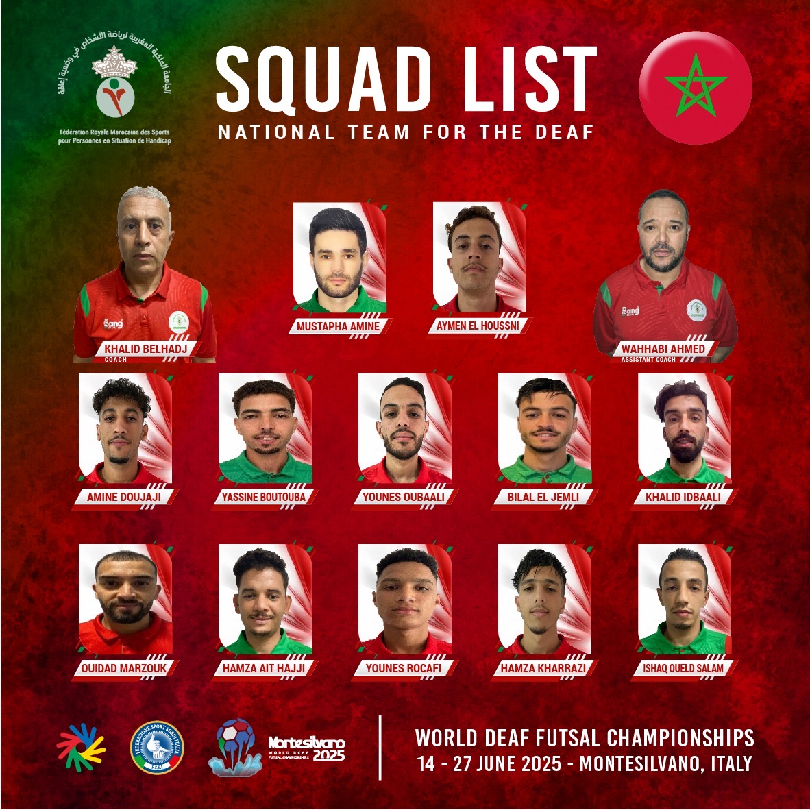 هذا ويتكون الوفد المغربي من 17 فرداً، من بينهم 12 لاعبا. وتمثل جهة سوس ماسة في هذه التظاهرة العالمية بثلاثة لاعبين، ينتمون إلى النادي الرياضي السوسي للصم بمدينة أيت ملول، ويتعلق الأمر بكل من الحارس أيمن الحوسني، واللاعب يونس أبعالي، واللاعب حمزة أيت حجي.
