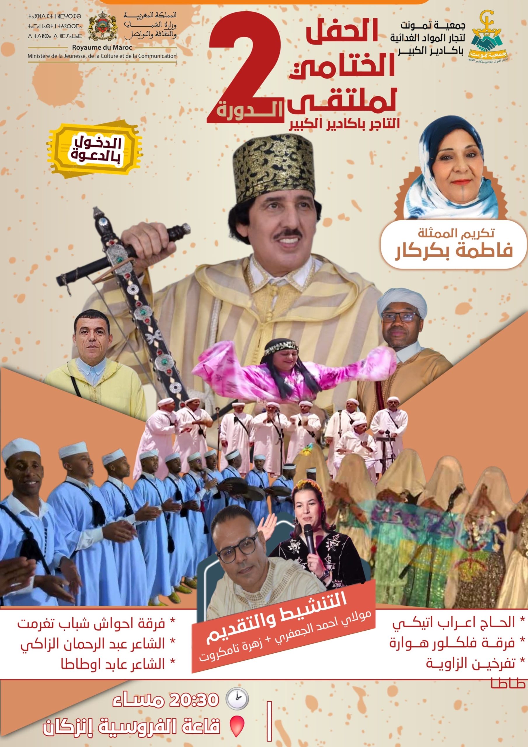 ليسدل الستار على هذه النسخة يومه الجمعة 25 يوليوز القادم ،بتنظيم حفل فني ثقافي بإحدى قاعات الحفلات ،بمشاركة عدد من الفنانين البارزين في الساحة الفنية الأمازيغية ،وتخصيص فقرات تكريمية لفعاليات تجارية وفنية ،امتنانا وتقديرا لما أسدوه من خدمات جليلة للاقتصاد والثقافة المحلية .