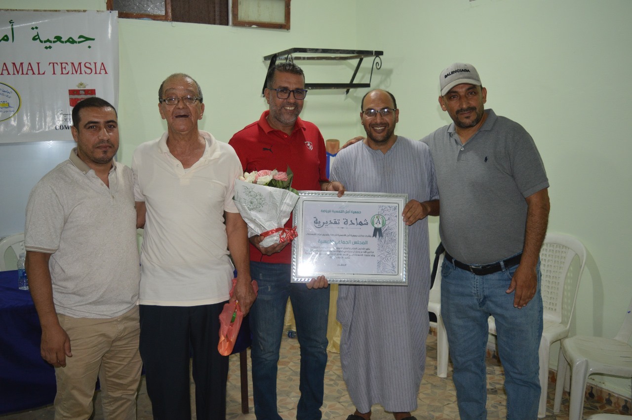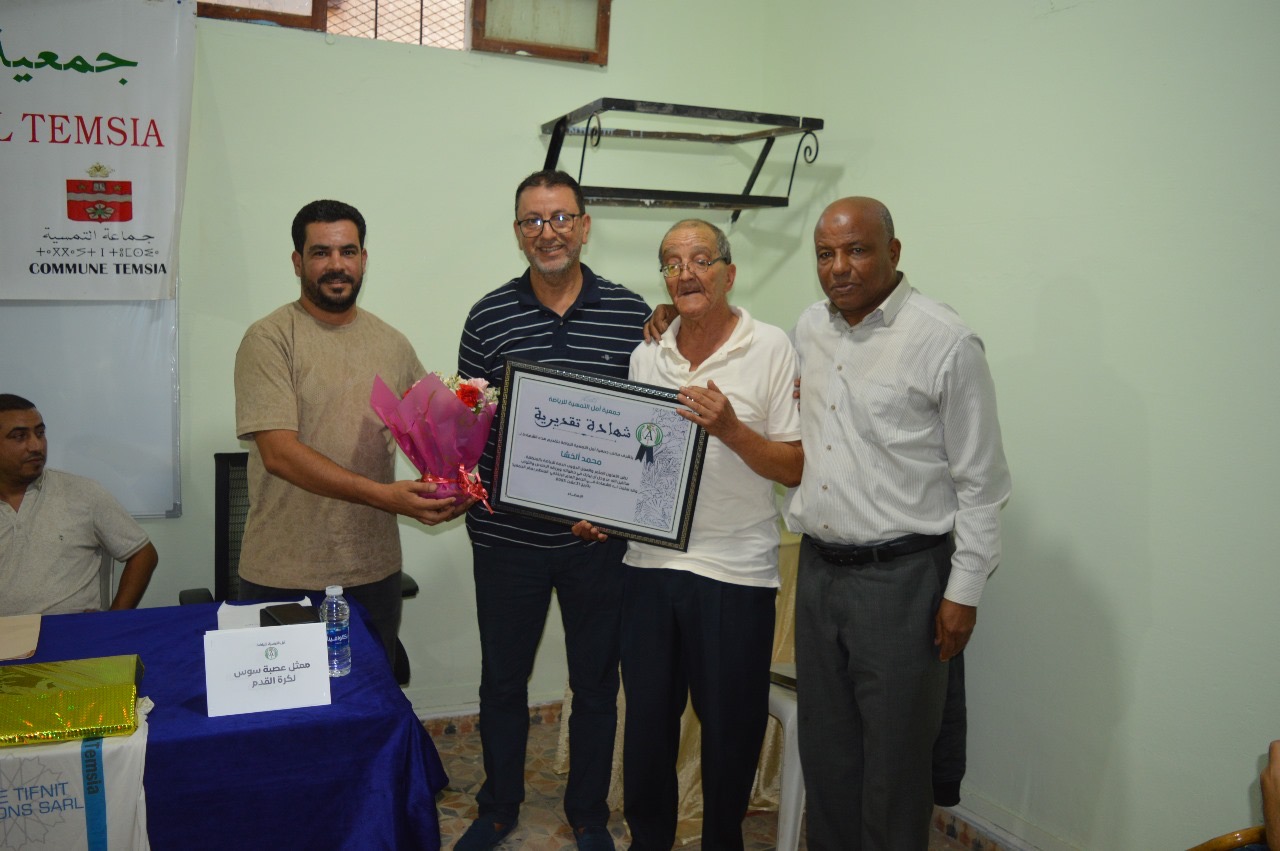 وقد شكلت المناسبة ،فرصة لتقديم المدرب الجديد محمد تيفروين ،الذي سيتولى ربان الفريق خلال الموسم الجديد وتكريم الحسين إخرشان ،اعترافا وامتنانا لما أسداه من خدمات جليلة للرياضة بجماعة التمسية ،وهو من الذين وضعوا اللبنات الأساسية لفريق أمل التمسية ،وتتلمذ على يده العديد من الشباب أبجديات كرة القدم .فضلا عن الالتفاتة للعديد من الوجوه الرياضية التي ساهمت في السير بالفريق إلى بر الأمان .