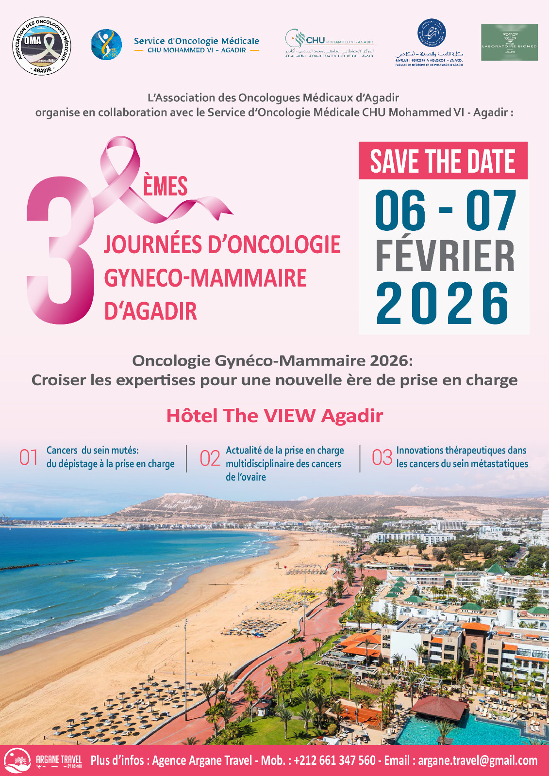 بتنسيق مع مصلحة الأنكولوجيا الطبية بالمركز الاستشفائي الجامعي محمد السادس بأكادير، تنظم “جمعية أخصائيي الأورام الطبية بأكادير”، الدورة الثالثة لأيام أكادير للأنكولوجيا النسائية الثديية،يومي 6 و7 فبراير 2026. (3è journées d’oncologie gynéco-mammaire d’Agadir) تحت شعار تجميع الخبرات من أجل عهد جديد في التكفّل بالعلاج“بمشاركة نخبة من الأخصائيين والخبراء في مجال الأنكولوجيا.