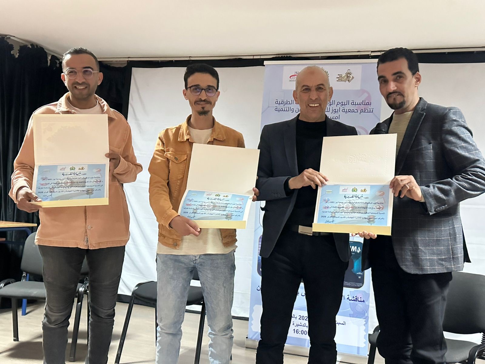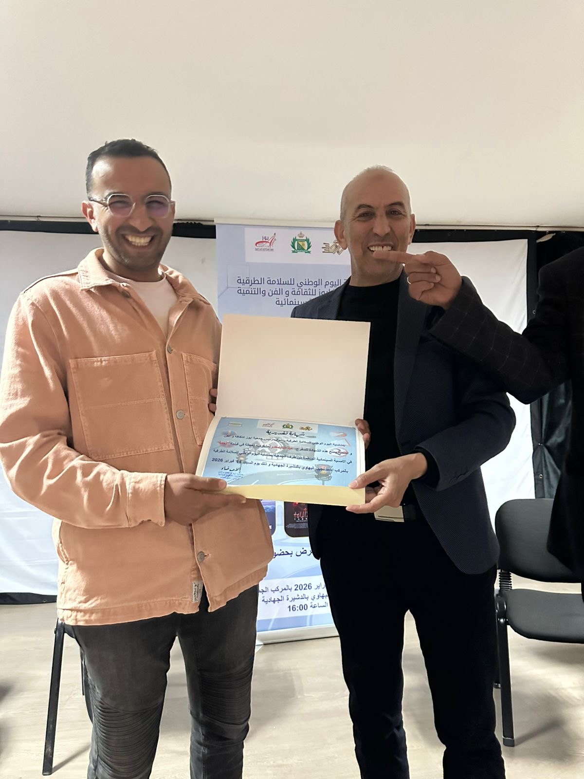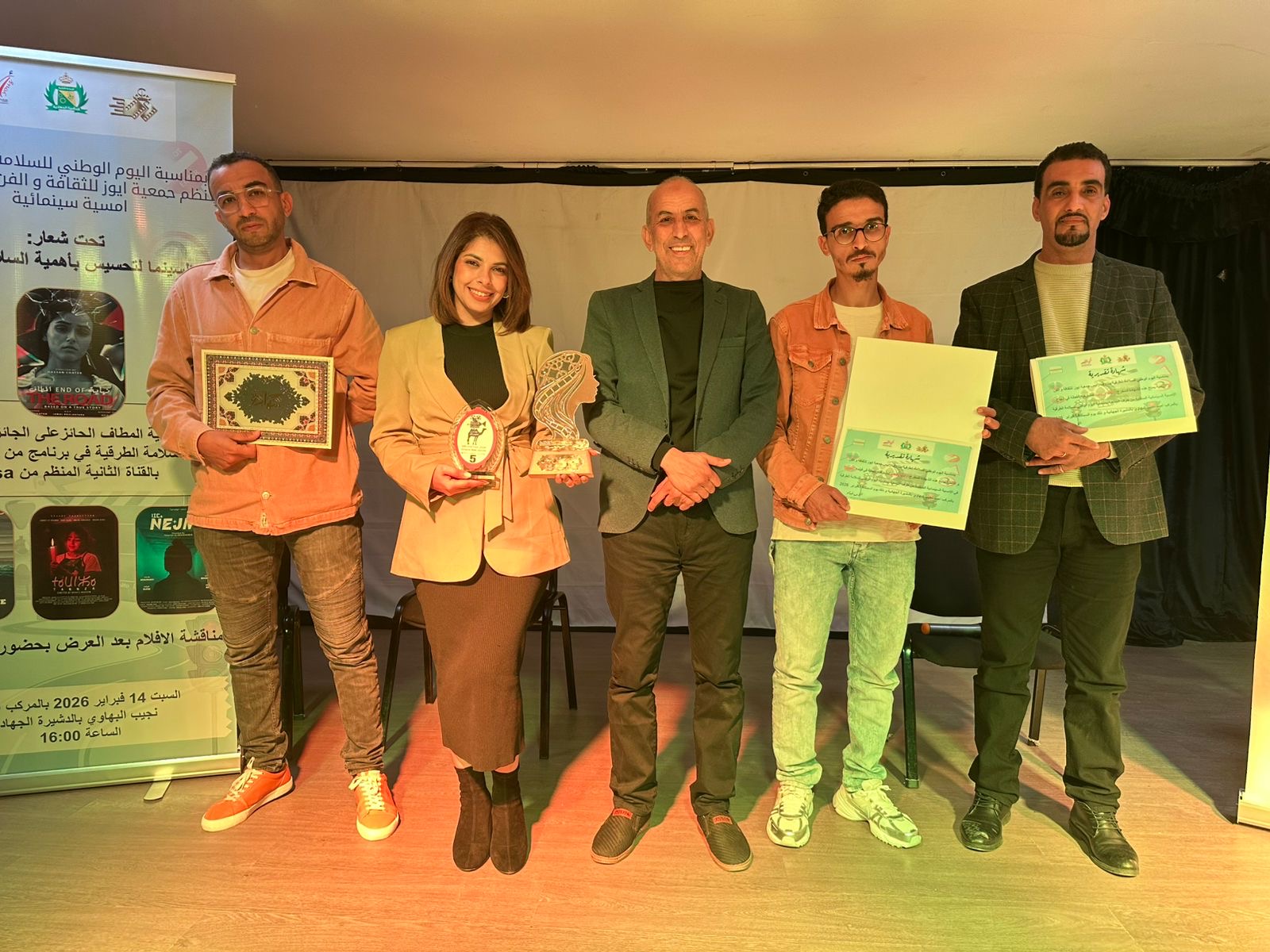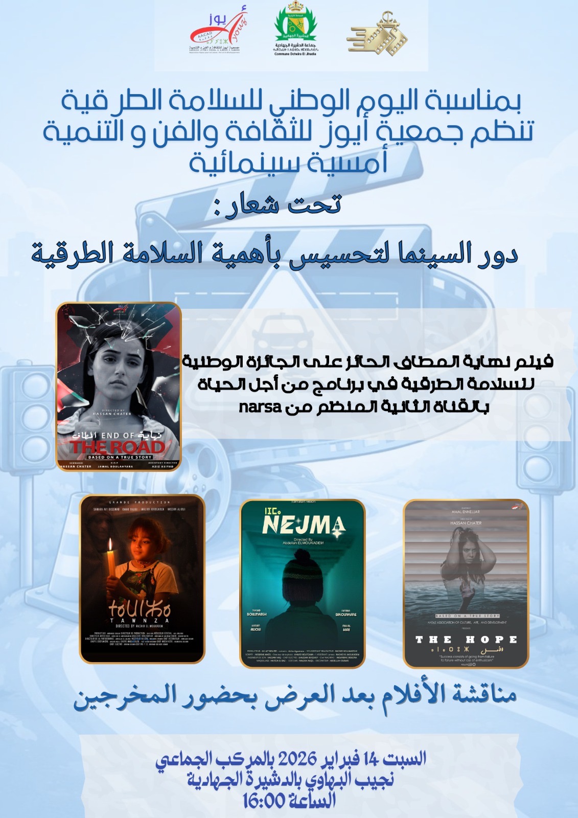 بمناسبة اليوم الوطني للسلامة الطرقية، نظمت جمعية أيوز للثقافة والفن و التنمية أمسية سينمائية تحت شعار : “دور السينما لتحسيس بأهمية التحسيس السلامة الطرقية” يوم السبت 14 فبراير 2026 بالمركب الجماعي نجيب البهاوي بالدشيرة الجهادية.